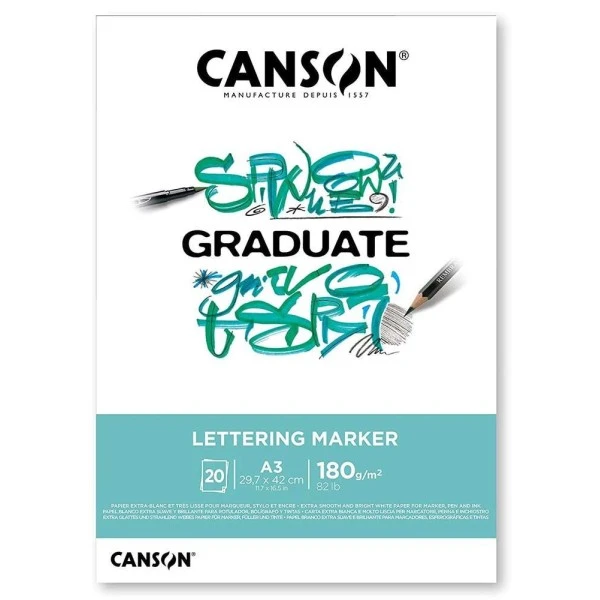 Le Bloc Canson Graduate – Lettering Marker au format A3 – 180 g/m² est le support parfait pour pratiquer le Lettering, ou l’art de dessiner les lettres en jouant avec les textures et les Ă©lĂ©ments graphiques. Ce papier blanc et très lisse est conçu pour la rĂ©alisation de dessins prĂ©cis et dĂ©taillĂ©s au feutre, au stylo et Ă l’encre.