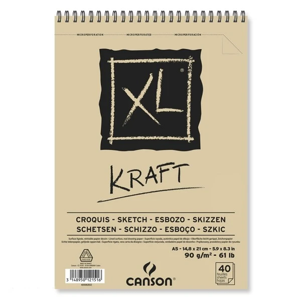Petit Bloc A5 Canson XL pour Kraft. Il sera idéal dans la pratique du croquis avec diverses techniques artistiques sèches allant du crayon au fusain en passant par le pastel.