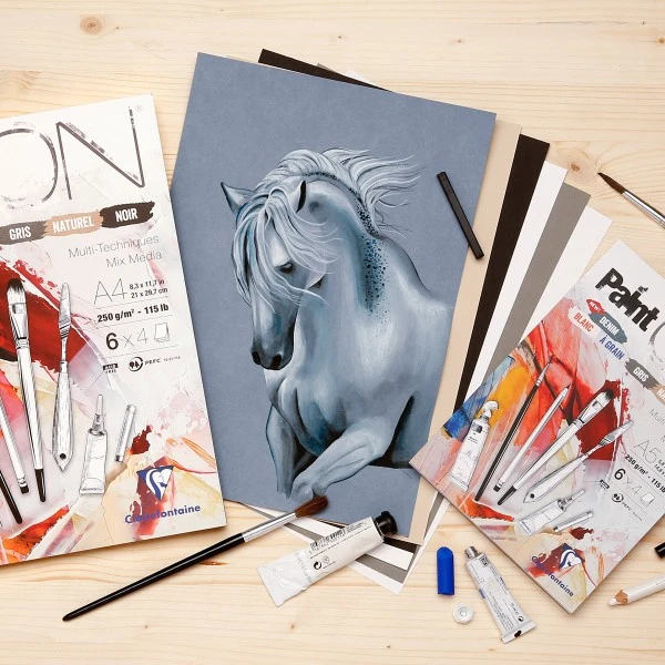 Les feuilles de ce bloc papier Paint’On ont ont un fort grammage de 250 gr/m² ce qui leur permettra de resister au grattage et de supporter plusieurs couches. Profitez de ses 6 types de papiers de qualité : papier blanc, Ă grain, Gris, Naturel et Noir pour dessiner, griffonner, noter ou s’entraĂ®ner au dessin.
