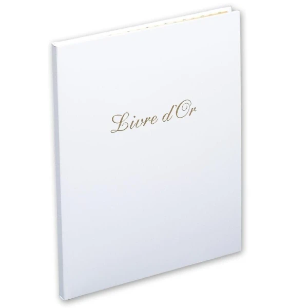 Livre d’or Balacron blanc de grande qualitĂ© avec tranche or et 100 pages de papier Clairefontaine.